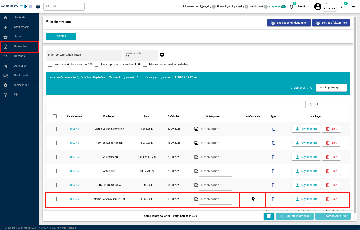 I Kredins reskontro vil slike kunder være merket med et pin-ikon i kolonnen «Info/advarsler».