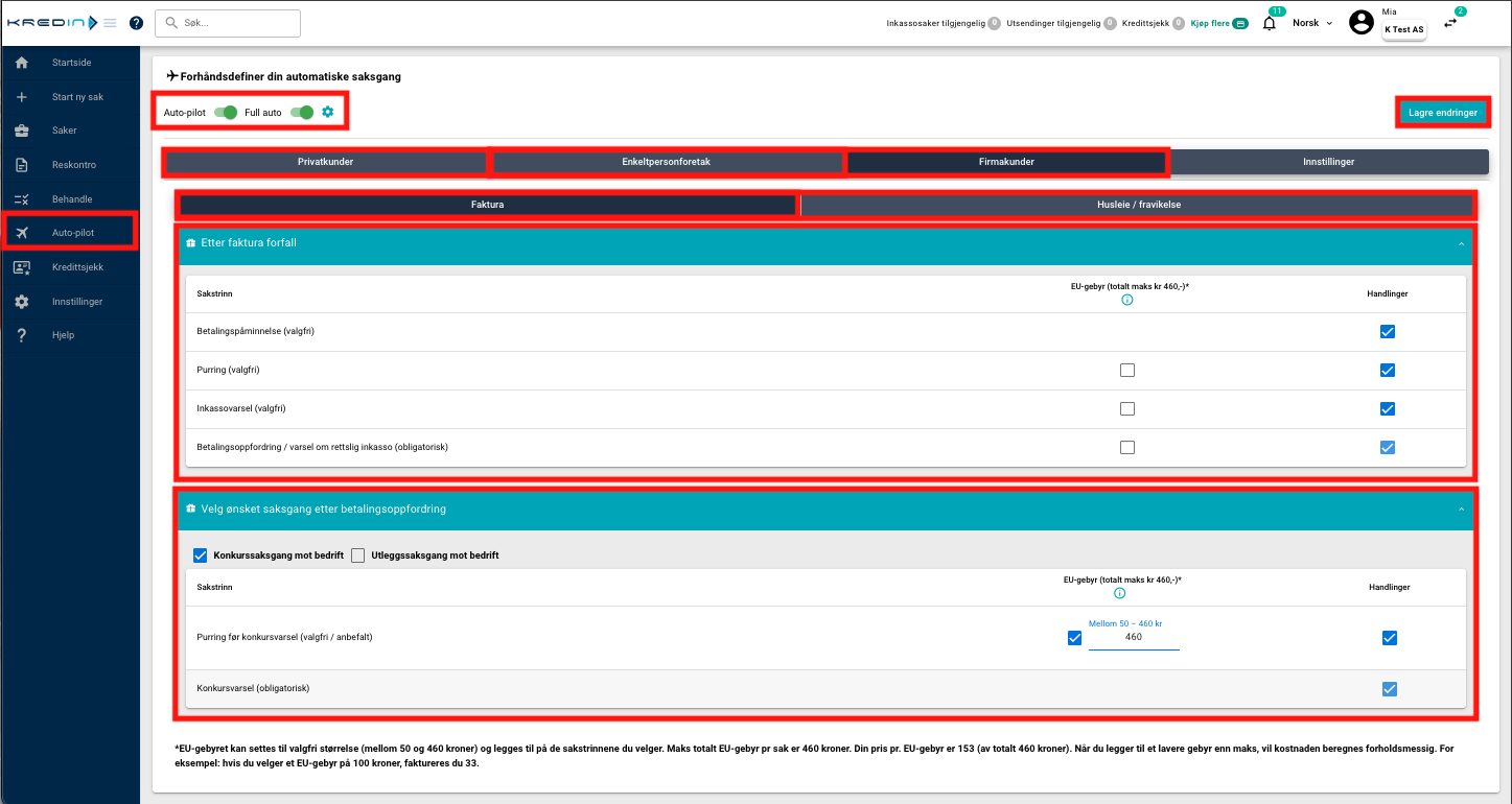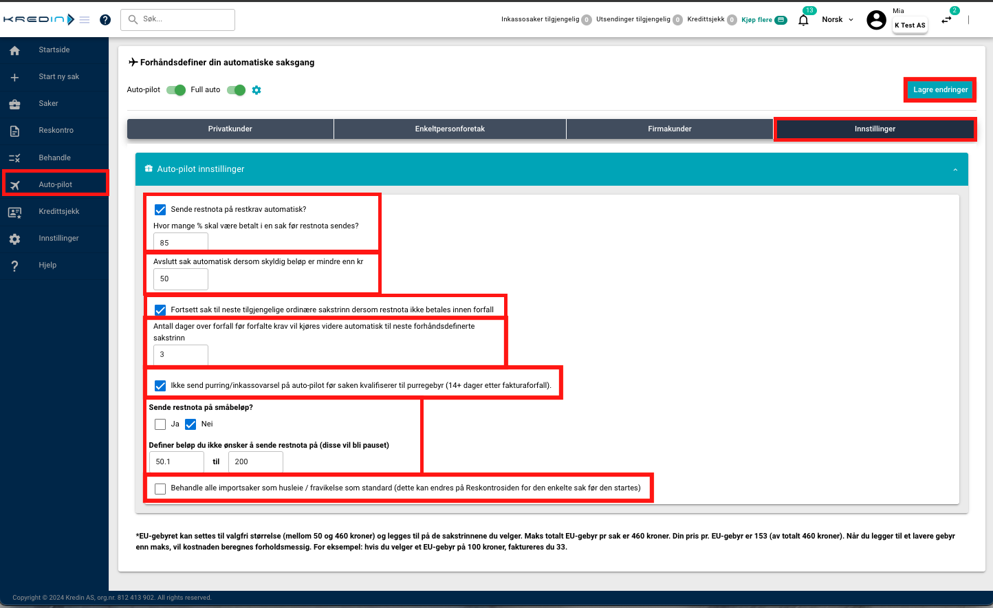 Under Innstillinger kan du velge hvor mange dager det skal være mellom hvert trinn, og om Kredin skal sende restnota automatisk dersom bare deler av kravet er betalt.