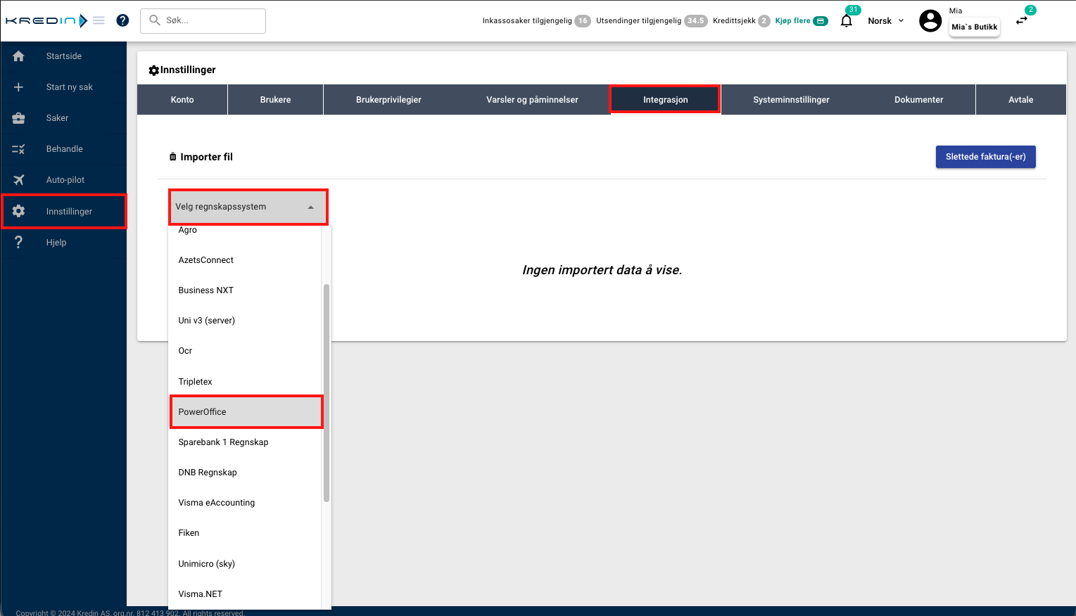 PowerOffice har en unik funksjon som gjør at du kan importere rentenota direkte til Kredin, slik at du kan kreve inn påløpte renter fra forfalte krav som er betalt for sent.