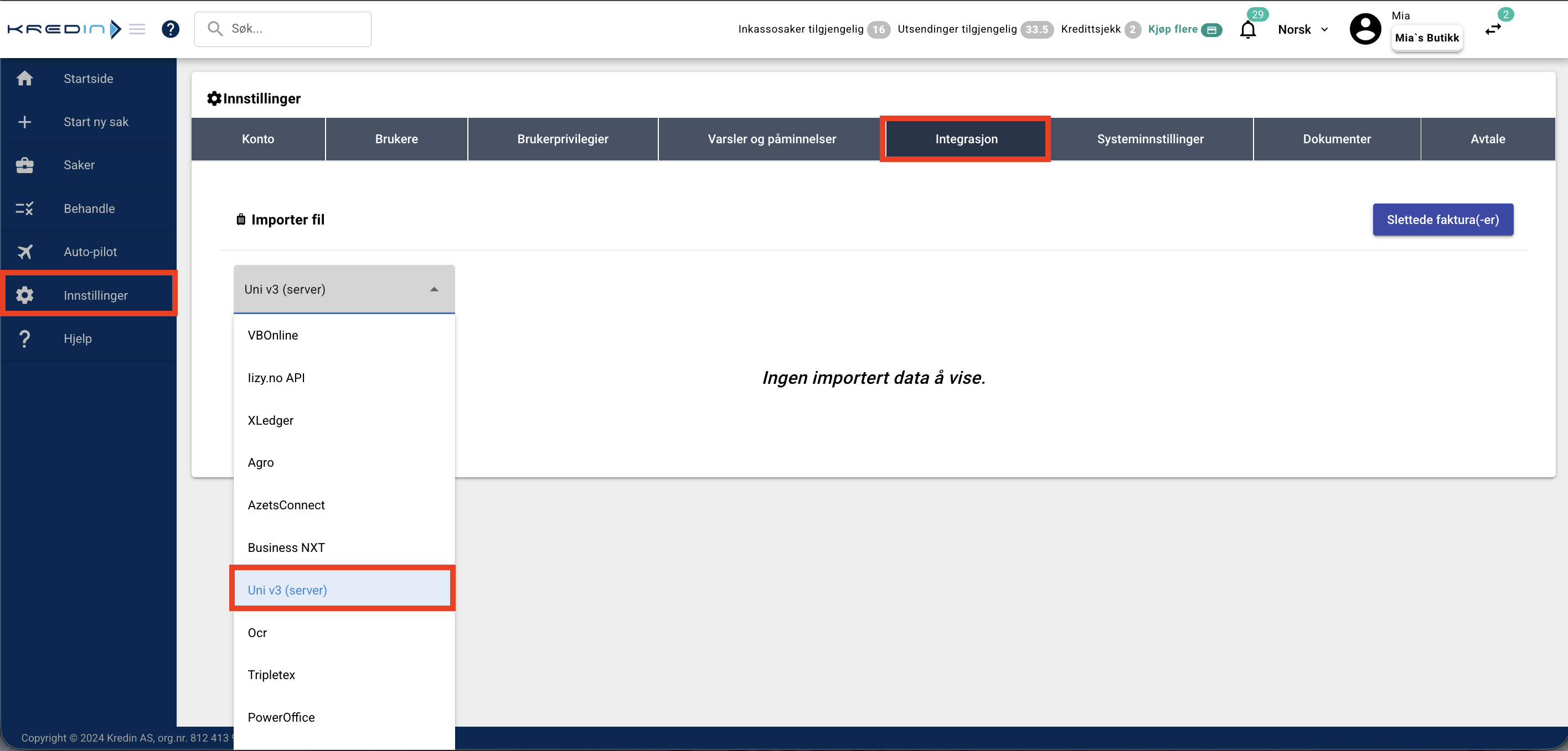 Innstillinger for inkasso (velg Kredin integrasjon):